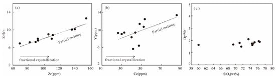 (a) Zr/Nb vs. Zr diagram; (b) Y vs. Ce diagram; (c) Dy/Yb vs. SiO2 diagram.