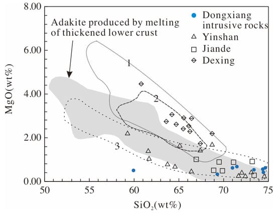 MgO vs. SiO2 diagram for the Dongxiang intrusive rocks, showing (1) adakite that is produced by melting of subducted oceanic slab; (2) Delaminated lower crust-derived adakitic rocks; (3) metabasaltic and eclogitic melts (1.0–4.0 GPa) [55]. Data were obtained from Zhao and Zhou, 2008.