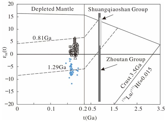 Zircon U–Pb dating has been used in previous research on the Dongxiang intrusive rocks [12]. In this study, Lu–Hf isotope analysis was also carried out on zircons with the same domain position or a similar structure (Figure 6a). Initial 176Hf/177Hf ratios and εHf(t) values were calculated at the time of zircon growth from the magmas. The results indicated that Dongxiang intrusive rocks have negative initial εHf values (age corrected using U–Pb age for individual grains), with a weighted mean of −11.8–−4.5. In addition, the Hf model ages of zircons from Dongxiang intrusive rocks were 1.01–1.33 Ga, with a two-stage model age of 1.33–1.94 Ga.