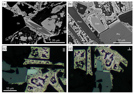 (a,b) Prismatic caswellsilverite crystals in sulphide aggregate; BSE. (c,d) Caswellsilverite is characterised by strong bireflectance reflected light: (c) parallel to polarizer; (d) perpendicular to polarizer. Cws = caswellsilverite; Gh = gehlenite; Prv = perovskite; Pwo = pseudowollastonite; Py = piryte; X = “mineral X”.