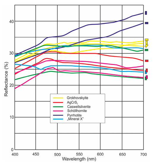 Reflectance of pyrrhotite (Pyh), schöllhornite (Slh), caswellsilverite (Cws), AgCrS2 (Ag), “mineral X” (MinX) and grokhovskyite (Ghy) measured in random sections parallel (II), perpendicular (pr) and at an angle (X) to the elongation of lamellar crystal.