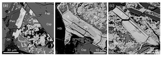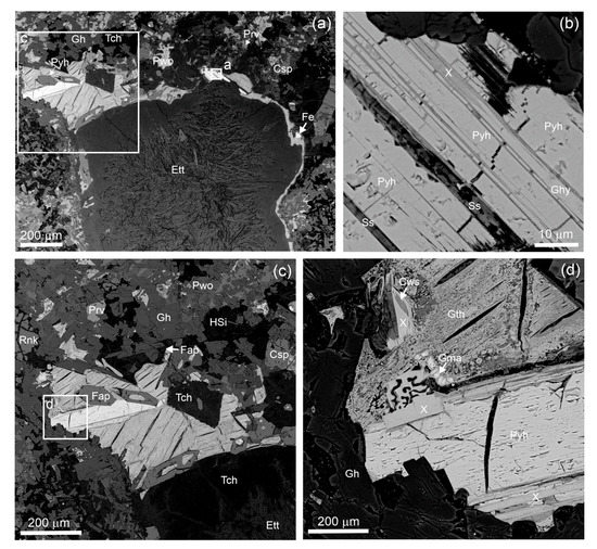 (a–c) Character of “mineral X” morphology; BSE images. Fe = native iron; Gh = gehlenite; Pyh = pyrrhotite; Py = pyrite; Fap = fluorapatite; Hem = hematite; Tch = tacharanite; Rnk = rankinite; Pwo = pseudowollastonite; X = “mineral X”.