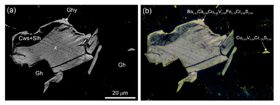 (a,b) Grokhovskyite exhibits high bireflectance (a—‖ to polarizer, b—⊥ to polarizer), fragment magnified in Figure 6c is outlined by frame; reflected light. (c) BSE image (grokhovskyite is shown by an arrow) and X-Ray maps of S, Fe, Cr, Cu, and Ba distribution. Pyh = pyrrhotite; Ghy = grokhovskyite.