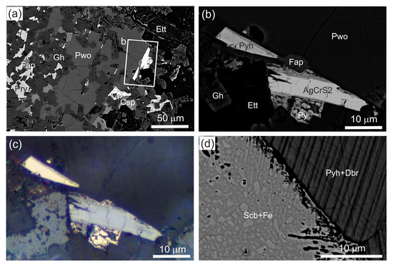 (a) Potentially new mineral AgCrS2 in gehlenite–pseudowollastonite paralava. The fragment magnified in Figure 8b is outlined by the frame. (b,c) Crystal of AgCrS2: (b), BSE; (c), reflected light. (d) Schreibersite–iron eutectic and pyrrhotite with daubréelite lamellas from an association with AgCrS2. (a, b, d)—BSE; (c), reflected light. Csp = cuspidine; Dbr = daubréelite; Ett = ettringite; Fap = fluorapatite; Fe = native iron; Gh = gehlenite; Prv = perovskite; Pwo = pseudowollastonite; Pyh = pyrrhotite; Scb = schreibersite.