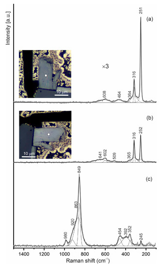 In the Raman spectra of caswellsilverite, there are two strong bands from Cr-S vibrations typical for the spectra of synthetic NaCrS2: 316 (A1) and 252 cm−1 (Eg) [25]. An orientation effect is observed: the band at 316 cm−1 polarizes, and its intensity drops by a factor of three times at polarization of the laser beam perpendicular to the direction of the flattening crystal (Figure 11a,b). To avoid artefacts in the spectra of the studied minerals, we also obtained their spectra after the laser-induced heating in air. The Raman spectrum of thermally changed caswellsilverite is related to sodium chromate. The strongest band in the spectrum at about 850 cm−1 is related to A1 vibrations in (CrO4)2- [26,27,28,29] (Figure 11c).