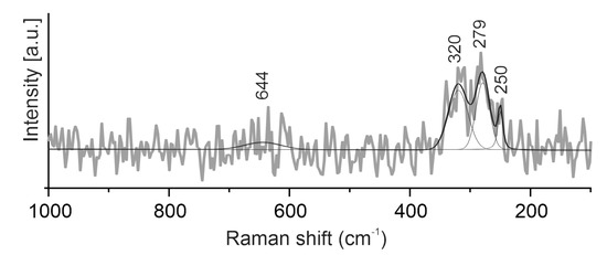The Raman spectra of grokhovskyite were measured on lamellar crystal in two orientations (Figure 12). The spectra featured weak bands at 315/319 cm−1 (A1) and 253/251 cm−1 (Eg), which are typical for synthetic CuCrS2 [30,31].