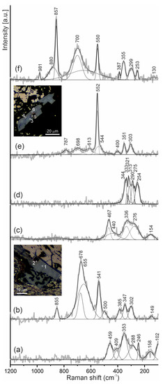 We failed to extract crystals of the studied minerals for a structural investigation; therefore, to obtain information about their structural features, we used Raman spectroscopy.