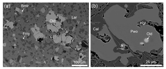 (a) Oldhamite-bearing fluormayenite–larnite rock from the Hatrurim Basin (Har Parsa Mt.). (b) Inclusion of oldhamite in pseudowollastonite from phosphide-bearing breccia. Bmlr = brownmillerite; Cal = calcite; Fmy = fluormayenite; Hgr = hydrogrossulare; Lar = larnite; Old = oldhamite; Pwo = pseudowollastonite.