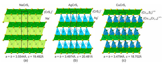 Hexagonal octahedral layers (CrS2)1−, between which M-sites of the monovalent cations Ag, Cu, and Na set, are present in the structures of layered chromium disulphides, MCrS2 (Figure 16), [44,45,46,47,48]. The sodium is at the octahedral coordination, whereas Cu and Ag are in the deformed tetrahedra. There are two types of tetrahedral site: α- and β- (Figure 16b) [45,46,47,48,49]. Ordered disulphide forms at temperatures below ~500 °C as a result of the occupation of the first type of site. In CuCrS2, an effect of some Cr moving into the space between disulphide layers was observed [45] (Figure 16c).