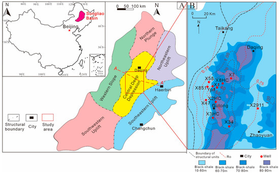 The Songliao Basin is one of the largest petroliferous basins, with an area of approximately 260,000 km2, located in northeastern China (Figure 1A). The basin has an NNE-SSW trend, with a length of 750 km and a width of approximately 370 km [53]. It can be divided into six first-order structural units: the Northern Plunge, Western Slope, Southwestern Uplift, Central Deep Depression, Northeastern Uplift, and Southeastern Uplift [54]. The Central Deep Depression is an important petroleum exploration area, encompassing the main shale oil and gas distribution districts, such as the Qijia-gulong and Sanzhao Sags (Figure 1A and Figure 2). The study area was mainly located in Qijia-gulong Sag, covering an area of approximately 15,000 km2 (Figure 1B).