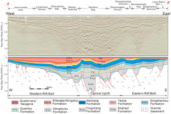 Regional seismic profile across the study area, showing the structural–stratigraphic characteristics of the basin; the section line (red line) is shown in Figure 1A (modified from Song et al. [54]).