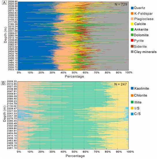XRD data showed that the FGSRs of the Qingshankou Formation were mainly composed of quartz, feldspar, and clay minerals (Table S1). The quartz content ranged from 0 to 52.9%, with an average of 33.8%; the feldspar ranged from 0 to 39.8%, averaging 16.5%; and the clay mineral content ranged from 0 to 58.8%, averaging 34.7% (Figure 4A). The carbonate mineral content was between 0% and 98.5%, with an average of 10.6%, including calcite (0–92.7%, average of 4.8%), ankerite (0–93.0%, average of 4.9%), and dolomite (0–98.2%, average of 1.0%) (Figure 4A and Figure 5). In addition, pyrite and siderite were present at an average content of 1.4% and 3.1%, respectively. The identified authigenic clay minerals comprised kaolinite, chlorite, illite, mixed-layer illite/smectite (I/S), mixed-layer chlorite/smectite (C/S), and a percentage of smectite in I/S (S%), for a total of 100%.