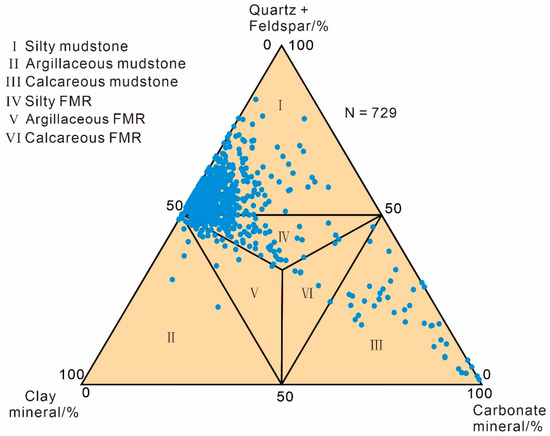 Ternary diagram showing the mineralogical composition of the FGSRs in the Qingshankou Formation. Note that FMR = fine mixed sedimentary rock.