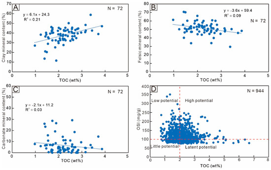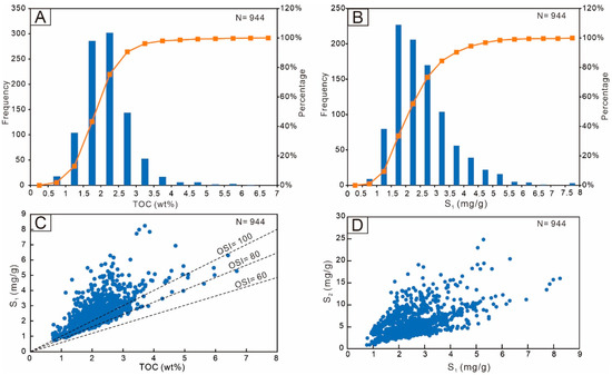 The abundance of OM in source rocks is an important indicator of hydrocarbon generation potential. TOC and Rock-Eval parameters were used to evaluate OM [70] abundance. The TOC content ranged from 0.73 to 6.68 wt%, with an average of 2.18 wt% (Figure 7A) (Table S2). The S1 values ranged from 0.76 to 8.25 mg/g, averaging 2.59 mg/g (Figure 7B), and S2 values ranged from 0.84 to 24.83 mg/g, with an average of 6.19 mg/g (Table S2). The oil saturation index (OSI) denotes the oil crossover effect and can be used to analyze oil production potential. It is calculated according to Jarvie [2].