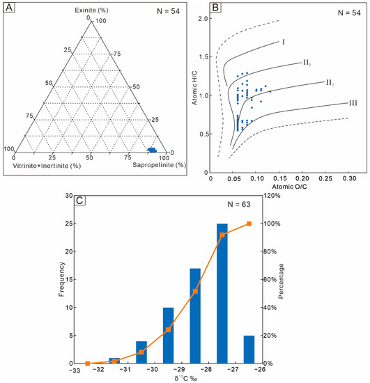 (A) Triangle figure showing the maceral compositions of FGSRs. (B) Classification of kerogen types of the FGSRs according to the van Krevelen diagram [71]. (C) Histogram of the δ13C values.