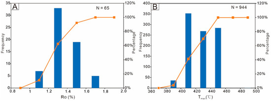 Ro values are generally used to indicate the maturity of hydrocarbon source rocks. The Ro values varied from 1.12 to 1.70%, with an average of 1.37% (Figure 9A), indicating that the shale rocks were in the middle to high stages of thermal maturation, having entered the oil generation window. In addition, the Tmax values between 381 °C and 481 °C, with an average of 427 °C, indicated that the source rocks had mature OM (Figure 9B).