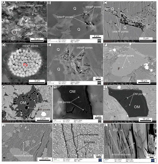 Pores in mudstones and shales are mostly nanometers to micrometers in size. The pores connect matrix-related spaces and fractures and act as important permeability pathways of unconventional shale gas and oil. Based on the relationships of pores and particles, Loucks et al. [75] proposed a simple and objective classification that included mineral matrix pores such as interparticle (interP) pores and intraparticle (intraP) pores, organic-matter pores, and fractures. This study used Loucks’s classification to analyze the pore characteristics of the FGSRs. Pores between grains, clay minerals, and crystals are interP pores. The rigid grains (quartz, feldspar, carbonate minerals, pyrite) can protect primary pores from compaction; therefore, the interP pores are more easily formed between rigid grains and soft grains (Figure 11A–C). They exhibited triangular, polygonal, or elongated morphologies. IntraP pores were distributed within grains, including pyrite framboids (Figure 11D), clay crystal aggregates (Figure 11E), dissolution pores within grains (Figure 11F), and fossil body pores. The pyrite framboid and clay aggregate pores had the greatest distribution of intraP, particularly intercrystalline pores within illite and chlorite. In addition, dissolution pores were observed within feldspar (Figure 11F) and calcite. These pores had elongated, polygonal, and elliptical outlines. OM pores occurred within OM (Figure 11G–I), which are usually found in relatively high Ro-value samples. These pores exhibited bubble-shaped outlines. Micro- and nanoscale microfractures usually occurred subparallel to the bedding plane (Figure 11J–L). Some of them were filled with bitumen (Figure 11K). According to the SEM-based pore type identification and statistical analysis, the FGSRs had mostly interP and intercrystalline pores, accounting for 42.5% and 31.3%, respectively, while intraP pores, OM pores, and microfractures accounted for 10.7%, 8.9%, and 6.6%, respectively (Figure 12).