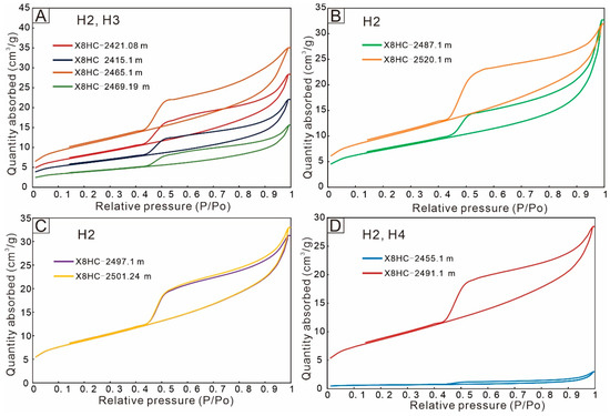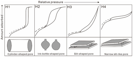 Low-temperature N2 adsorption was used to analyze mesopore characteristics. Hysteresis is caused by the noncoincidence of isothermal adsorption and desorption curves. Its morphological characteristics, such as hysteresis loops, can be used to characterize pore shapes in micromaterials. In this study, the hysteresis loop types were classified into types H1, H2, H3, and H4 according to the IUPAC guidelines (Figure 13) [76]. The results of the classification were used to analyze the pore types of the different lithofacies of FGSRs. The silty mudstones contained H2 and H3 type hysteresis loops (Figure 14A) in the low-pressure section (P/Po < 0.45), wherein the adsorption and desorption coincided, indicating that closed pores were more developed within small apertures. In the medium-pressure section (0.45 ≤ P/Po < 0.95), wider type H2 hysteresis loops were found, and the adsorption curve changed slowly, while the desorption curve exhibited an obvious inflection point and a steep change. Type H3 had narrower hysteresis loops, and the adsorption curve was nearly parallel to the desorption curve. In the high-pressure section (0.95 ≤ P/Po < 1), the slopes of adsorption and desorption curves both increased, indicating that macropores were associated with cracks [77]. The H2 and H3 hysteresis loops revealed complex pore structures and ink-bottle-shape and wedge-shape pores, respectively. SFMR, AFMR, and CM all exhibited type H2 hysteresis loops (Figure 14B–D). In addition, the CM also exhibited type H4 hysteresis loops (Figure 14D), which indicated low adsorbing capacity; additionally, the adsorption and desorption curves tended to overlap, indicating association with narrow slit-like pores.