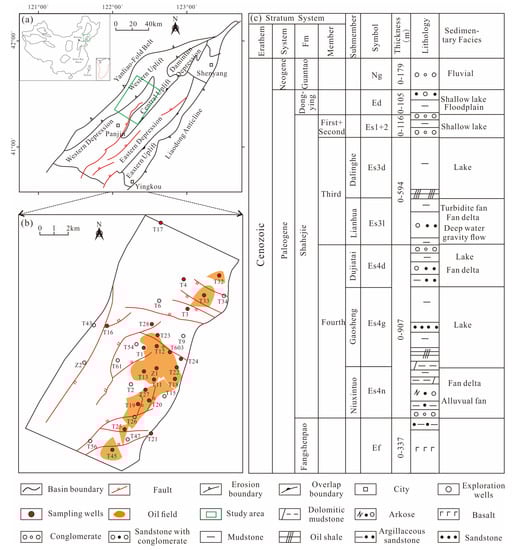 Map of the structural and stratigraphic characteristics of the Niuxintuo area, Liaohe Western Depression. (a) Tectonic units of Liaohe Depression. (b) Structural map of the Niuxintuo area. (c) Stratigraphic column map.