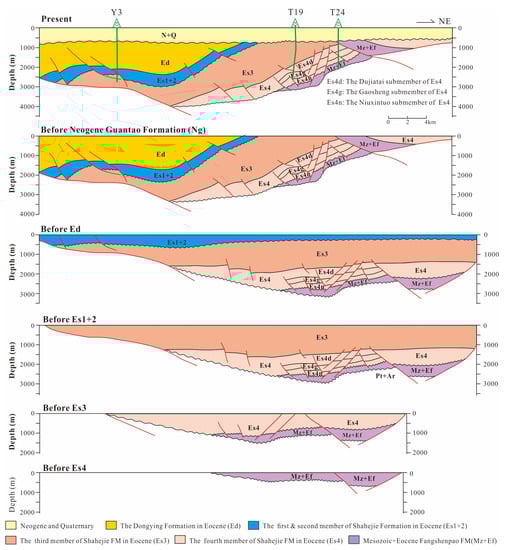 The Bohai Bay Basin is a Cenozoic rifted basin located on the eastern coast of China (Figure 1a) [21]. The study area, covering ~400 km2, comprises the northernmost part of the Liaohe Western Depression in the northeast Bohai Bay Basin (Figure 1a,b). The strata are illustrated in Figure 1c. The study area has experienced four tectonic stages from the Paleogene to Quaternary [20,22,23]. The first stage was the initial extensional rift period during the Paleocene, with the deposition of the Fangshenpao Formation (Ef) (65–45.4 Ma). The Niuxintuo area was subjected to tensile forces, forming boundary faults oriented in the NNE direction. These faults (e.g., the Taian Fault) controlled the formation and evolution of the basin. The second stage was an intense rift period during the Eocene, with the deposition of the Es4 and Es3 members (45.4–38 Ma). The strata are extensive and thick [24]. The third stage was the strike-slip rift period during the Oligocene (38–24.6 Ma), which resulted in the Dongying Formation (Ed). During the Oligocene, the regional stress field changed from rifting to strike-slip, creating a series of near-EW-oriented faults. The strata were uplifted and eroded (the maximum erosion thickness reached 1500 m), resulting in the general erosion of the upper Es3, Es2, and Es1 members and the Ed Formation. The fourth stage was the depression period from the Neogene to the Quaternary (24.6–0 Ma), in which the Guantao (Ng), Minghuazhen (Nm), and Quaternary Formations were formed, without any prominent faulting (Figure 2) [25].