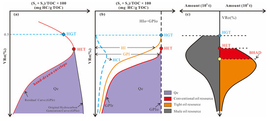 The hydrocarbon generation potential method was proposed, using a large number of Rock-Eval/TOC datasets to investigate the variation in the hydrocarbon generation potential with the VRo values so as to simulate the thermal evolution of source rocks (Figure 3a) [11]. According to the mass balance principle, the hydrocarbon potential of source rocks mainly includes three parts: (1) the kerogen or residual organic matter (OM) that has not been transformed into hydrocarbons (pyrolysis hydrocarbons: S2); (2) the hydrocarbons that have been generated but not discharged (free hydrocarbons: S1); and (3) the discharged hydrocarbons (Qe) [11,32]. Considering that S1 and S2 are the actual quantitative measurements of the hydrocarbon generation capacity obtained through Rock-Eval pyrolysis [33], the hydrocarbon generation potential index (GPI) can be defined as (S1 + S2)/TOC × 100, which reflects the current amount of hydrocarbons generated per unit of TOC by source rocks. Then, the variation in GPI with thermal maturity can be used to quantitatively characterize the hydrocarbon generation and expulsion of source rocks. The original GPI (GPIo) should remain unchanged before hydrocarbon expulsion (Qe = 0). With increasing thermal maturity, the GPI of the source rock decreases, indicating that the hydrocarbons have been expelled.