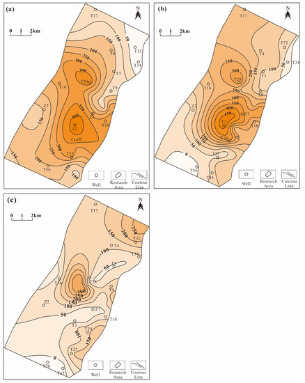 Thickness distribution map of the Es4 source rocks in the study area. (a) The Es4d source rocks; (b) The Es4g source rocks; (c) The Es4n source rocks.