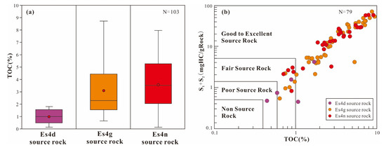 Source rock potential of the Es4d, Es4g, and Es4n source rocks in the Niuxintuo area. (a) TOC box plot. (b) (S1 + S2) vs. TOC plot.