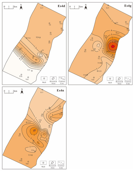 From bottom to top, as the sedimentary water gradually deepened, the distribution of the source rocks gradually expanded. As shown in Figure 4, the source rock thickness in the Es4n sub-member reaches 350 m (average = 120 m) and gradually decreases in the southward direction. Owing to the structural uplift and denudation in the north during the late Oligocene, the sedimentary centers of the Es4g and Es4d sub-members shifted from the north to the central part of the Niuxintuo area. The Es4g and Es4d source rocks are widely distributed, ranging from 50 to 500 m (average = 240 m) and from 20 to 420 m (average = 257 m), respectively.