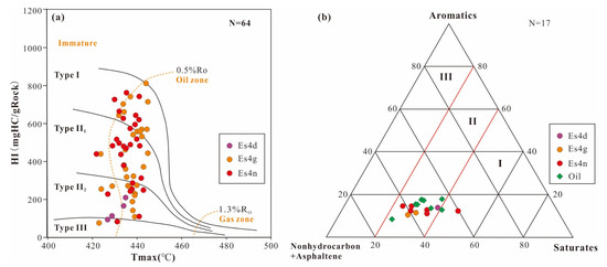 Classification plots of the Es4d, Es4g, and Es4n source rock types in the Niuxintuo area. (a) Cross plots of Tmax versus HI. (b) Triangle diagram of the hydrocarbon group components.