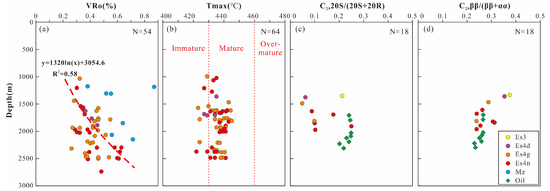 In this study, VRo, Tmax, and biomarker parameters were adopted to assess the thermal maturity of source rocks. Figure 9a shows that the VRo values of the Es4 sub-member range from 0.26% to 0.63% (with corresponding depths of < 2500 m). However, a higher VRo value (0.88%) was found for the shallow-buried Mesozoic mudstone sample, mainly due to the regional tectonic uplift in the late Oligocene. The average Tmax values of the Es4d, Es4g, and Es4n source rocks are 431, 437 and 435 °C, respectively (Figure 9b). Steranes C2920S/(20S + 20R) and C29αββ/(αββ + ααα) are often used to assess thermal maturity [42,43]. The C2920S/(20S + 20R) of the Es4 source rocks is 0.24–0.37 (with an average of 0.12), and the C29αββ/(αββ + ααα) is 0.24–0.37 (with an average of 0.29), suggesting that the source rocks are in an early mature stage (Figure 9c,d). Overall, the Es4n and Es4g source rocks are in the low-mature to mature stage, while the Es4d source rocks are in the immature to low-mature stage.