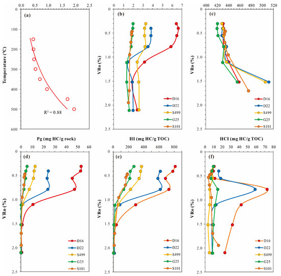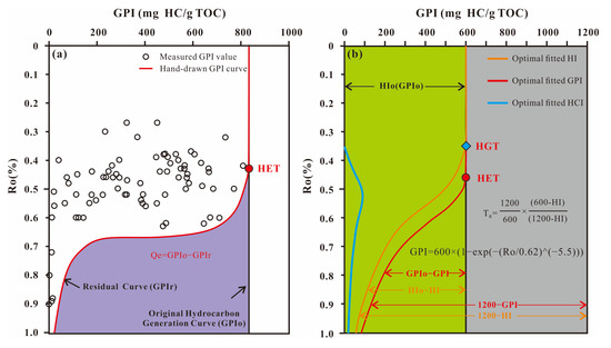 Numerical analysis can be used to quantitatively characterize the variations in GPI and VRo based on the abundant Rock-Eval/TOC datasets, as shown in Equation (2) [16]. For immature source rocks, GPIo is equal to HIo: