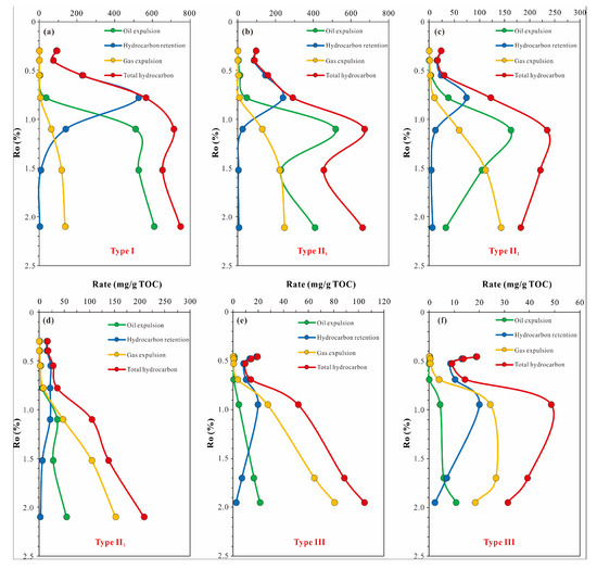 The rates of hydrocarbon generation, expulsion, and retention and their variations during the thermal simulation are illustrated in Figure 11. When VRo = 0.3%, retention oil is present in the low-maturity simulated samples. With the increase in VRo to 0.5%, the hydrocarbon generation (total hydrocarbon) rate and retention rate exhibit a slight decreasing trend, while the oil expulsion rate of the type I–III source rocks increases from 0 to 1.5, 11.86, 3.58, 2.74, 1.01, and 0.09, respectively, suggesting that the shale samples discharge a small amount of oil. As the thermal maturity continually increases, the hydrocarbon generation, expulsion, and retention rates increase rapidly. When VRo = 0.78%, the hydrocarbon retention rates of the type I and II samples show a peak value, while the hydrocarbon retention rate of the type III shale peaks at VRo = 0.95%. The inflection point of the hydrocarbon retention rate corresponds to the onset of the rapid increase in the hydrocarbon expulsion rate, which means that large amounts of hydrocarbons are expelled. When VRo is > 1.1%, the oil expulsion rates of the type I–II samples display a decreasing trend after reaching the peak value, and their hydrocarbon retention rates continue to decrease. The gas expulsion rates of the type I–III samples continue to increase, mainly because of the cracking of the kerogen and oil. For the type I and II samples, the variation trend of the hydrocarbon generation rate is consistent with the oil expulsion rate, while for the type III samples, the hydrocarbon generation rate is consistent with the gas expulsion rate, indicating that the type III shale has good gas generation potential.