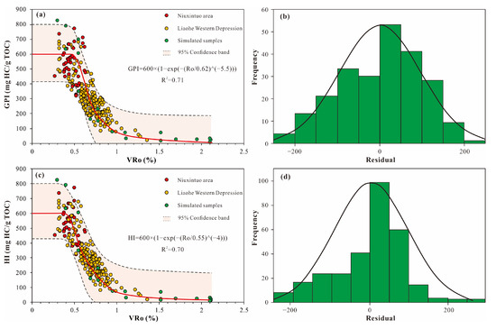 Considering the low maturity of the Es4 source rocks in the study area, the Rock-Eval pyrolysis and VRo data of mature source rocks and the five simulated shales in the Liaohe Western Depression were also adopted to ensure that the datasets were distributed in a complete thermal maturity sequence. Using numerical analysis, the optimal fitting curves and 95% confidence bands of GPI, HI, and VRo were quantitatively characterized (Figure 12). For the type II source rocks (containing a certain amount of type I kerogen) in the study area, the optimal fitted GPI and HI curves exhibit positive relationships with the measured GPI and HI values, and the correlation coefficient (R2) reaches 0.7. In the regression model, the GPIo and HIo of the Es4 source rocks are 600 mg HC/g TOC (Figure 12a,c). The β1 and β2 of the Es4 source rocks are 0.55%VRo and 0.62%VRo, respectively, which correspond to the thermal maturity observed when large amounts of hydrocarbons are generated and discharged from source rocks. The residual histograms of GPI and HI show a normal distribution, indicating the reliability of the regression relationship (Figure 12b,d).