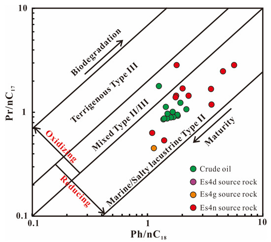 The onset of hydrocarbon generation has been discussed for decades, and it can be concluded that the oil generation stage of low-maturity source rocks approximately corresponds to VRo = 0.2%–0.7% or 0.3%–0.6% [45,46,47]. The hydrogen-rich organic maceral and reductive hypersaline paleoenvironment is considered to provide the indispensable conditions for the hydrocarbon generation of low-maturity source rocks [48,49,50]. The relationship between the Pr/n-C17 and Ph/n-C18 of the Es4 source rocks and crude oil indicates a reducing sedimentary environment and a gradual decrease in the thermal maturity of the source rocks (Figure 14).