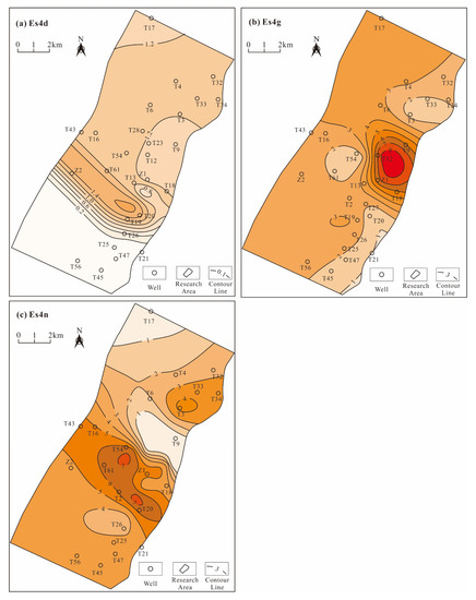 Here, the TOC contents and hydrocarbon generation potential (Pg = S1 + S2) are adopted to investigate the OM abundance of the Es4 source rocks (Table 1). The TOC contents of the Es4d, Es4g, and Es4n source rocks are mainly between 0.53–1.55%, 1.54–4.44%, and 2.11–5.18%, with averages of 1.00%, 3.09%, and 3.56%, respectively (Figure 5a). The Pg value of the Es4d source rock ranges from 0.45 to 4.23 mg HC/g rock, with an average of 1.49 mg HC/g rock. By contrast, the Pg values of the Es4g and Es4n source rocks are higher than 6 mg HC/g rock, with averages of 16.4 and 18.7 mg HC/g rock, respectively. The relationship between the TOC and Pg illustrates that the source rocks are poor to fair in the Es4d sub-member and good to excellent in the Es4g and Es4n sub-members (Figure 5b). Figure 6 shows the TOC distribution maps of the Es4 source rocks. The Es4d source rocks exhibit a limited area of TOC distribution, while the Es4g and Es4n source rocks show extensive TOC distribution ranges, whose OM abundance was generally concentrated in the central portion of the study area (Figure 6).