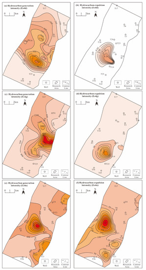 The hydrocarbon generation of source rocks leads to a decrease in TOC [19,36]. The hydrocarbon resource potentials calculated using the measured TOC and the restored TOCo show considerable differences [16]. Compared with the TOC distribution, the TOCo contents increase significantly with increasing thermal maturity (Figure 15). Based on the TOCo, GPIo, effective thickness, and density of the Es4 source rocks, the Ig and Ie were obtained (Figure 16). The maximum Ig values of the Es4d, Es4g, and Es4n source rocks could reach 1.00 × 107, 4.00 × 107, and 3.20 × 107 t/km2, respectively, indicating their prospective hydrocarbon generation potential. The Ig value of the Es4n source rock was distributed throughout almost all of the study area, except for the southernmost area. The maximum Ie values of the Es4d, Es4g, and Es4n source rocks could reach 3.00 × 107, 2.60 × 106, and 5.00 × 106 t/km2, respectively. By contrast, the distribution range of Ie was more limited than that of Ig. Similarly, the Qg of the Es4 source rocks in the study area was considerable, while the Qe was limited. The Qg values of the Es4d, Es4g, and Es4n source rocks were 3.99 × 108, 11.42 × 108, and 7.02 × 108 t, respectively. In the Es4d and Es4g sub-members, the limited hydrocarbon expulsion ranges led to a small Qe (2.50 × 106 and 2.10 × 107 t). By contrast, the expulsion amount reached 1.09 × 108 t in the case of the Es4n source rocks.