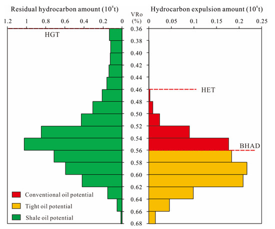 For the Es4n source rock, the conventional oil potential between the HET and BHAD is 3.20 × 107 t (Figure 18). Below the BHAD, the tight oil potential is 7.70 × 107 t. The residual hydrocarbon calculated using Equation (13) is the shale oil potential, which could reach 5.93 × 108 t. Considering the processes of hydrocarbon migration, accumulation, preservation, or destruction, it is necessary to use the appropriate accumulation coefficient. The adjacent source–reservoir conditions in the study area lead to a greater accumulation coefficient. In this study, 30%, 45%, and 54% were adopted as the accumulation coefficients of three kinds of resources, respectively [51]. In the Es4n sub-member, the conventional, unconventional tight, and shale oil resources are 1.00 × 107, 3.50 × 107, and 3.20 × 108 t, respectively. In the Es4g sub-member, the shale oil resource is 6.05 × 108 t. In general, the conventional oil resources in the Niuxintuo area are relatively limited. The exploration of unconventional tight oil resources should focus on the Es4n sub-member, while the exploration of shale oil should focus on the Es4g and Es4n sub-members.