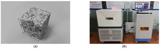 The granite sample was collected at a depth of around 450 m from the pre-selection area of Beishan in Gansu, China. Its density is 2.59–2.70 g/cm3. Its mineral composition is as follows: feldspar (60.59%), quartz (34.09%), and biotite (5.32%). Since the Beishan granite has a low permeability, the determination of its pore structure characteristics was relatively difficult. The method applied in this study was nuclear magnetic resonance (NMR). The sample was cut into a 40 mm × 40 mm × 40 mm cube and a low-field NMR instrument (Meso MR23-060H-I, Niumai, Suzhou, China) with a magnetic field strength of 0.5 T and a magnetic field stability ≤250 Hz/h was used (Figure 2). The open porosity was extremely low, only 1.8%. The PSD between 0.07 μm and 20 μm (mainly between 0.2 μm and 10 μm) was obtained. The PSD curves of the four investigated rocks are shown in Figure 3.