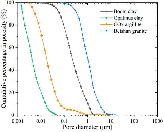 The safe disposal of high-level nuclear waste is of great significance to the utilization and development of nuclear energy. At present, the internationally recognized safe disposal scheme is to bury the high-level waste deep in rock layers. Argillite and granite are the preferential surrounding rocks for underground nuclear waste repositories. The advantages of argillite include ultra-low permeability, high plasticity, and high adsorption capacity for radionuclides [1,2]. Granite is characterized by a good integrity and uniformity, low porosity and permeability, and small deformation and high strength [3]. In Belgium, the Boom clay has been chosen as a model site and in situ experiments have been conducted in the Mol underground laboratory [4]. In France, the Callovo-Oxfordian (COx) argillite in the Bure site in the eastern Paris Basin has been reported to have favorable characteristics (high compactness and low permeability) [5,6]. In Switzerland, the Mont Terri Rock Laboratory has investigated the Opalinus clay as a possible host rock for long-term geological disposal of radioactive waste [7,8]. In Finland, the pegmatoid granite has been taken into consideration for the final disposal of the spent nuclear fuel in the Onkalo research facility in Olkiluoto [9]. In China, the Beishan granite in Gansu Province has been investigated and identified as the preferential rock layer for the storage of nuclear waste [10,11].