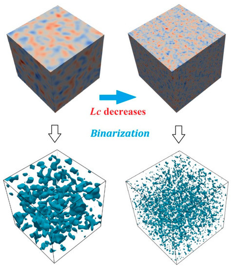 Thus, is the key factor in determining the fluctuations in a field. As is illustrated in Figure 5, as decreases, the fluctuation frequency increases, and a much wavier field is obtained. After the binarization transformation, a field with a high value is composed of huge blocks. Conversely, the field with a low value consists of small, dense blocks.
