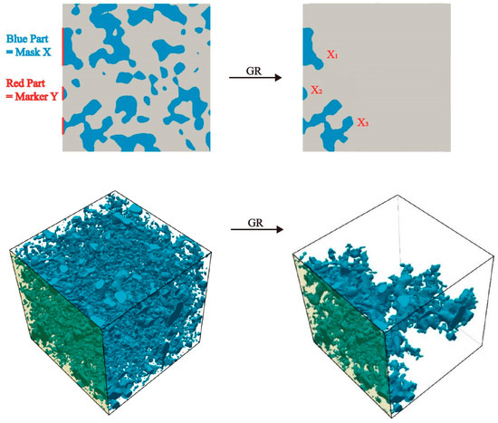 The GR operation can be used to extract the pore space that is connected to the boundary. According to Vincent [42], GR is composed of iterations of elementary geodesic dilation on marker Y in mask X, and then it extracts the connected components (, , ) in the mask from the marker (Figure 8). This operation is expressed as follows: