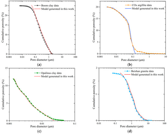 PSDs of the generated models. (a) Boom clay; (b) COx argillite; (c) Opalinus clay; (d) Beishan granite.