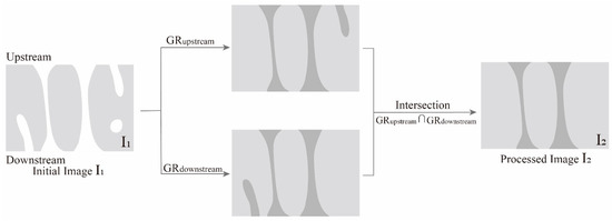 The first step is to extract the interconnected pathways between the upstream and downstream sides, which are the basis for fluid migration. As is shown in Figure 13, the initial image is subjected to GR operations that start from the upstream and downstream sides. Following this, the Boolean intersection is able to provide image I2, which is the extracted interconnected pathways. This process can be expressed as follows: