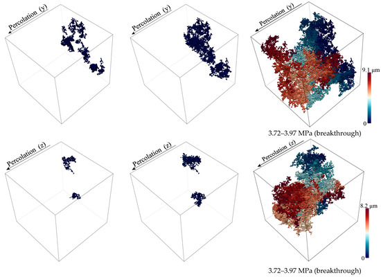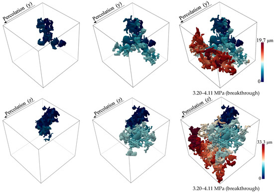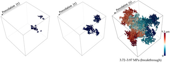 In order to better understand the characteristics of the gas breakthrough pathways, by counting the number of steps (number of “dilation + intersection”, see Equation (15)) that would be passed by carrying out the GR operation (the size of each step is determined by the size of the SE), the length of the breakthrough path, and the corresponding tortuosity were obtained. The results of the numerical calculations are presented in Table 3 and Table 4. The values of tortuosity reflect the complexity of pore space morphology and the existence of multiple gas breakthrough pathways in Boom Clay and COx argillite. Figure 15 and Figure 16 show the gas migration process with increasing gas pressure in the three axial directions of the Boom clay and COx argillite models.
