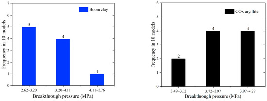 For the Boom clay model, the breakthrough pressure frequency indicates that five realizations provide results of 2.62–3.20 MPa, four provide results of 3.20–4.11 MPa, and one provides results of 4.11–5.76 MPa. Therefore, the gas breakthrough pressure of the Boom clay is more appropriately defined as 2.62–4.11 MPa.
