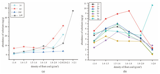 Distribution of Se concentrations in floating coals of densimetric fractions, where (a) is medium–high-sulfur coal and (b) is medium–low-sulfur coal.