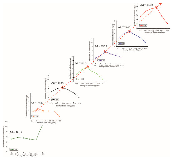 The secondary factor affecting the Se concentration of floating coal is the ash content of coal. Coal is an energy source made of plant fossils with a long formation history, and it is produced in a complex coal-forming geological environment. The origin of selenium in coal is also very complex; the primary source of selenium is coal-forming plants, and the paleogeographic environment during the coal-forming period, underground magmatic rock activity, large-area seawater intrusions, groundwater and fault structures are all also important sources of selenium. The six “parabolic-like” floating and sinking coal samples are all located in the Yangzi plate of China, and all of them have experienced extensive seawater intrusions in geological history. During its long geological history, the selenium in the coal is stored in the minerals of the coal in the form of selenides and selenates. These minerals are also important contributors to the ash content of coal, so there is a correlation between selenium and ash content [48,49,62,65]. Figure 2 and Figure 6 can also verify the correlation between selenium and the ash content.
