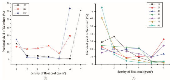 Selenium yield in coal samples of densimetric fractions (a) for high-sulfur coal and (b) for medium–low-sulfur coal.