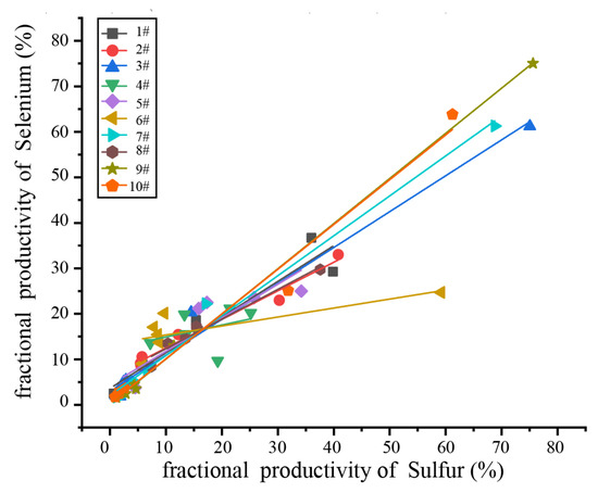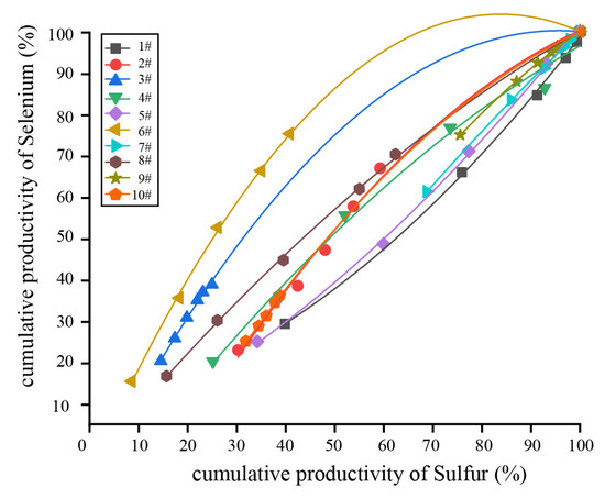 As shown in Table 5, the yield and cumulative yield of the selenium and sulfur in each densimetric fraction of the 10 floating coal samples were calculated, and there seemed to be no rule to follow based on the analysis alone (Figure 3). However, if the yield and cumulative yield of Se are compared with the yield and cumulative yield of sulfur (Figure 4 and Figure 5, respectively), it can be found that the trend of the yield and cumulative yield of Se and sulfur in each densimetric fraction coal is highly consistent and highly positively correlated, except for the abnormal data of the individual floating coals.