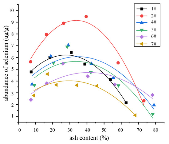 As shown in Table 5, 36 subsamples from six non-high-sulfur floating coal samples of 1#, 2#, 4#, 5#, 6# and 7# were selected for ash determination. The correlation analysis found that the ash content and Se concentrations in the floating coal of each densimetric fraction of the same raw coal were positively correlated. The correlation coefficient ranged between 0.6503 and 0.9670, averaging 0.8147. The correlation results are shown in Table 6 and Figure 6.